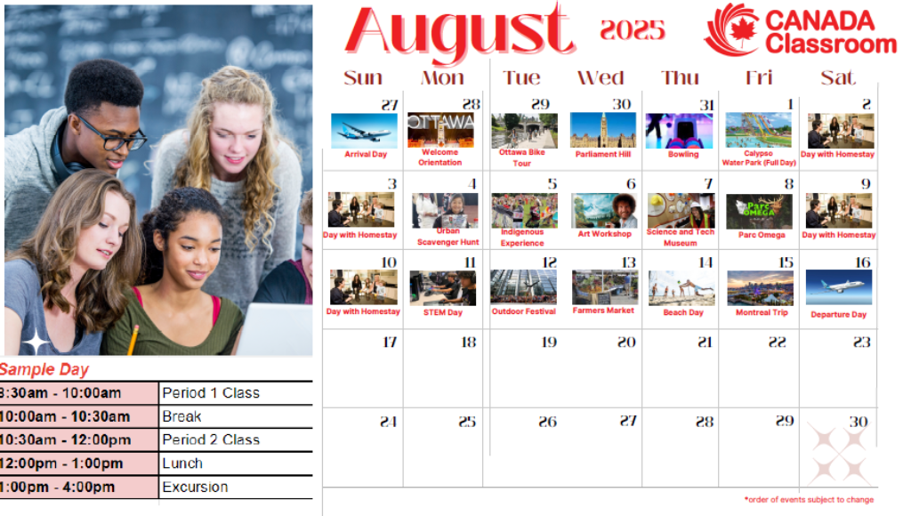 Each weekday combines a morning of ESL instruction followed by an afternoon of activities or excursions. Some full day excursions will be provided over the course of the three-week program.